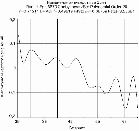 При выборе возрастной шкалы мы остановились на парной. Работа по выбору шкал с учетом нормирования параметров длилась около месяца с помощью Table Curve 2D. Дело в том, что погодовая шкала дает очень точные колебания и активности и скорости ее изменения у каждого человека в лонгитюдном исследовании. Однако, несмотря на высокую надежность данных (что уже было показано), дробность шкалы снижает степень приближения моделей до 71 %. Это нас не устраивало. Трехлетний интервал возрастной шкалы повышал степень приближения до 100 %, но «смазывал» пики и провалы, а значит, не давал «резкости» наблюдений через корреляции амплитуды и длины волн скоростей в различных подсистемах. Эту шкалу также пришлось испытать на всех выделенных подсистемах форм деятельности и сознания и выбраковать. Шкала возрастов с двухлетним интервалом, несколько смазывая пики волн, дает степень приближения от 92 % и выше, а кроме того, служит очень наглядной графической иллюстрацией в рамках статпакета SPSS, что немаловажно при представлении логики изложения и результатов. Только один первый график амплитуды и частоты колебаний величины скорости изменений количества форм деятельности по каждому человеку мы приводим на годовой интервальной шкале для иллюстрации всех оттенков подъемов и провалов. Повысить надежность годовой шкалы позволят лонгитюдные исследования объемом не менее 1500 – 2000 наблюдений. Это дело будущих исследователей.