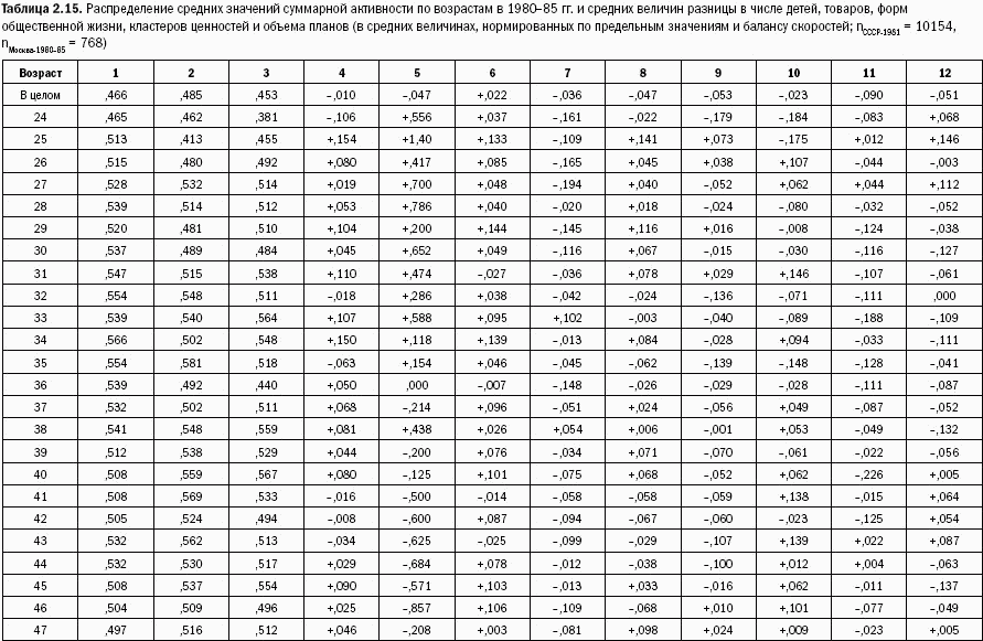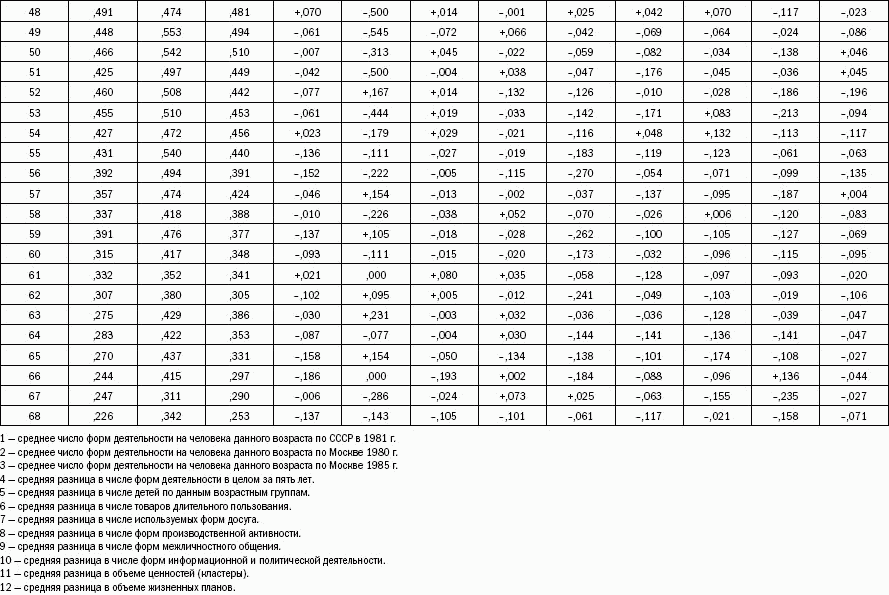 Замечу, что при рассмотрении матрицы 297 мы укрупняли общественную работу до 6 пунктов за счет «слипавшихся» в реальной практике форм, разбивая их при отдельном рассмотрении для получения более плавной «гауссианы» средних величин активности и скоростей и, следовательно, более качественной их дифференциации. Если в матрице 297 воспроизводство населения представлено фактом наличия детей до 18 лет, то здесь процесс замещения поколений фиксируется шкалой от +3 до – 3 детей, появляющихся в определенной возрастной группе и выходящих из нее. Надо, конечно, брать процесс в чистом виде от дня рождения человека до дня рождения у него в семейной паре своих детей, но и при несовершенном параметре зависимости уже видны. Ценностные ориентации приведены у нас выше в количестве 27, а не 29 кластеров, потому что в двух независимых рядах кластеров были пары «труд – работа» и «образование – учеба», что было объединено, но вколичественных волнах скоростей рассматривается отдельно.