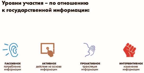 • Компетентность. При росте прозрачности государства происходит умножение государственной информации и усложнение связей между ее частями. Участие теперь требует способности управлять потоками информации, способности интеллектуальной и образовательной для анализа информации, некоторого количества практических интернет-навыков. А также отдельной компетенции — приобретать то и другое. Открытость и прозрачность государства предназначены не всем, а только тем, кто окажется способным что-то делать.