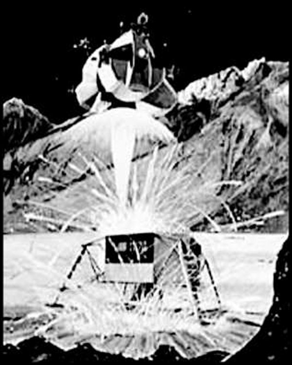 А вот опять фильм – вид из командного отсека на приближающийся лунный модуль на фоне Луны. Он вдруг начинает поворачиваться, потом останавливает вращение, тормозит при приближении к командному отсеку. И хоть бы язычок пламени из ясно видимых в кадре двигателей ориентации, с помощью которых якобы осуществляются все эти маневры! Сплошные комбинированные съемки все это!