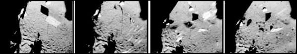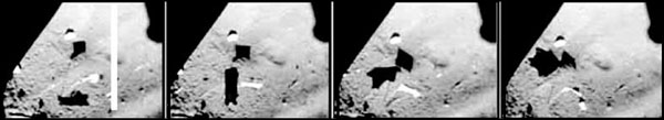 При посадке газовая струя двигателя ударяет непосредственно в лунную поверхность. А при взлете нижняя часть лунного модуля – посадочная ступень, – остается на Луне, и струя газа от двигателя взлетной ступени ударяет именно в нее, а не в грунт (рис. 103). Так что камням просто неоткуда взяться – посадочная ступень все-таки не из кирпича сложена. Что действительно летит во все стороны при старте с Луны – это всякие лоскутья и лохмотья, которые газовая струя взлетного двигателя, бьющая в упор в посадочную ступень, отрывает от ее теплоизоляции. Эти лохмотья хорошо видны на видеоролике, который снят через иллюминатор взлетной ступени «Аполлона-14» во время ее старта с Луны: history.nasa.gov/40thann/mpeg/ap14_ascent.mpg (2 Мбайта) (рис. 104).