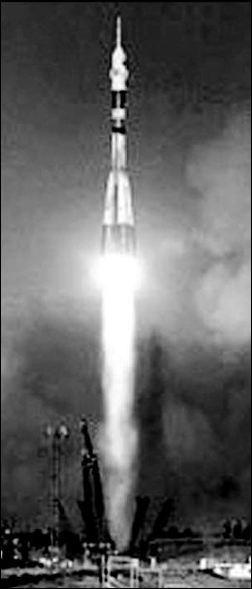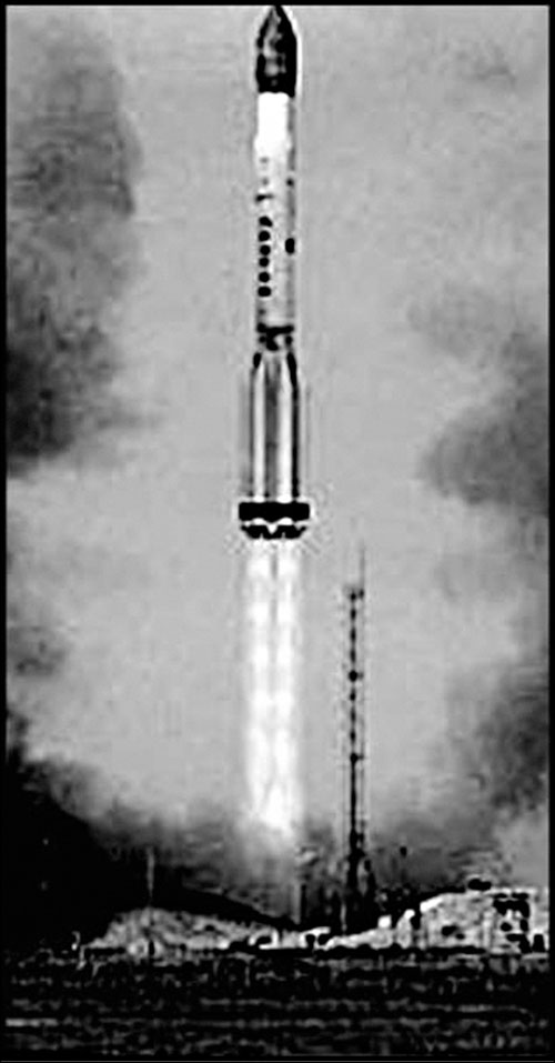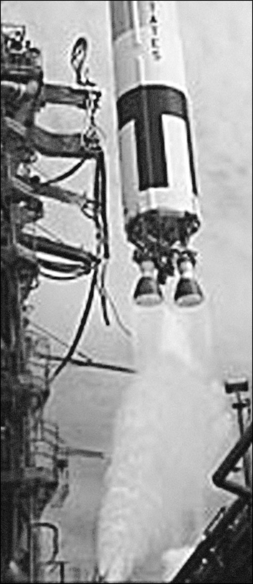 Четвертое фото (рис. 110) – старт ракеты «Титан-2» с кораблем «Джемини-11». «Титан» использует топливо, похожее на топливо «Протона». Окислитель – тот же самый (АТ), а горючее – так называемый «аэрозин-50»: смесь НДМГ с обезвоженным гидразином в пропорции 1:1. Конечно, двигатели «Титана» далеко не столь мощные, как «протоновские», но все-таки «Титан» – носитель, выводящий на орбиту двухместный космический корабль: тяга его двигателей – 210 тонн. А их пламя еле заметно на фоне облаков.