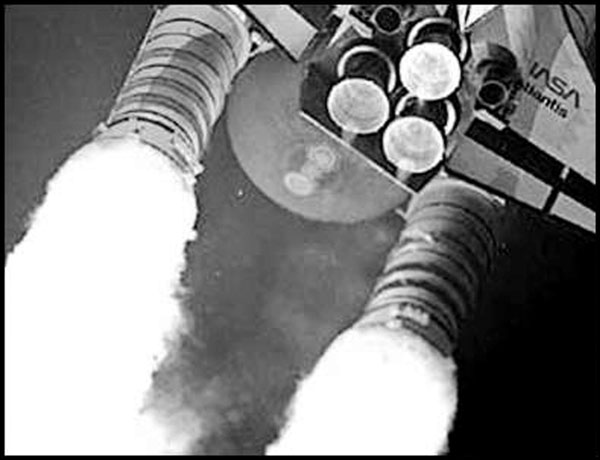 На втором снимке (рис. 108) – двигатели стартующего «Шаттла». Твердотопливные ускорители по бокам оставляют после себя громадные сверкающие колонны пламени, а пламя от трех главных двигателей в хвосте «самолета», работающих на жидком кислороде и водороде, – голубое, прозрачное и почти незаметное. Хотя двигатели эти – достаточно мощные: тяга каждого из них – 200 тонн.