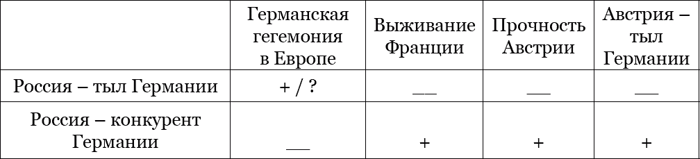 С начала 1870-х проявляется двойственное отношение новой Германии к России: формальное сотрудничество при попытке подстраховаться против русских, втянув Австрию в германскую сферу влияния, соединив балтийский и карпатский узлы Балто-Черноморья. Будет ли Россия опорным глубоким тылом нового германского восточного центра, или она представит вызов этому центру, нейтрализуемый австрийским авангардом? – такой вопрос вставал перед Германией. С устранением Австрии из биполярного расклада Европы, в глазах Бисмарка и его преемников, она обретала роль, которая ранее ей отводилась в планах стремившихся к европейской гегемонии французских руководств – в планах Людовика XV, Талейрана, Полиньяка, Наполеона III. Сама же Россия оказывалась в положении, когда, соотнося себя с европейским раскладом, она должна была выбирать между ролью германского тыла и попыткой бросить Германии вызов в качестве ее соперницы, потенциального восточного центра Европы, претендентки на австрийское наследство. Кто будет основным тылом Германии, обеспечивающим ей перевес над Францией, – Австрия или Россия? Ответ на этот вопрос во многом определял выживание Австрии и Франции. Все эти выборы оказывались связаны зависимостью. Россия, не позволяющая немцам подмять и подавить Францию, становилась тылом ненадежным, на роль главного тыла выдвигалась Австрия, а Петербург становился центром, конкурирующим с Берлином. Последний оказывался прямо заинтересован в развороте России лицом к Азии, и Россия, которая позволила бы подавить до конца Францию, становилась бы привилегированным германским тылом: но при этом перед Берлином вставал призрак грозной восточной силы, контролирующей балто-черноморский «вход» Европы и ликвидирующей суверенную Австрию. Все эти связи можно представить в таблице: