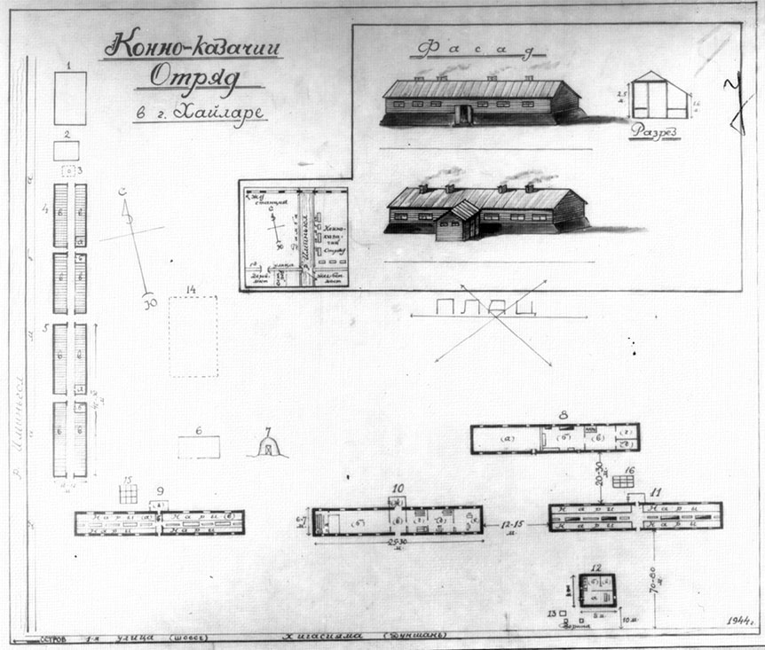 В июле 1942 года отряд Пешкова был передислоцирован на северную окраину Хайлара в специально подготовленный для этого военный городок на правом берегу реки Иминьгол (Иминьхэ), недалеко от железобетонного моста через реку. В расположении городка находились три казармы (две были заняты личным составом, одна – штабом), две конюшни, кухня, столовая, баня и прачечная, оружейный и вещевой склады. Все здания имели вид обшитых тесом полуземлянок, располагавшихся вдоль речной дамбы и 1-й улицы. Своими фасадами строения военного городка выходили на широкий плац. Городок был окружен рвом в метр глубиной и земляным валом. Выход военнослужащих за пределы военного городка разрешался только в гражданской одежде.[302]