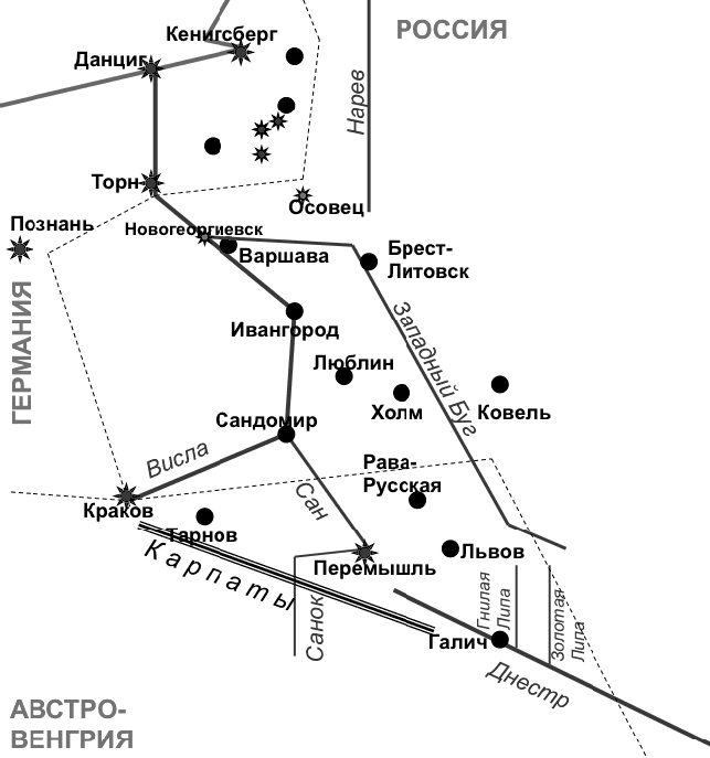 Слабое развитие дорожной сети резко повышало ценность немногочисленных транспортных узлов. Это привело к развитию фортификации. Нужно сказать, что настоящих укреплений, сравнимых с Мецем или Верденом, на востоке не было, исключая, наверное, Кёнигсберг и, может быть, Перемышль. Но устаревших, или незаконченных, или воображаемых крепостей было очень много. С немецко-австрийской стороны – Торн, Познань, Бреславль, Краков, Галич, Миколаев, Львов… С русской – Осовец, Новогеоргиевск, Гродно, Ковно, Оолита, Варшава, Ивангород, Ломжа, Остроленка, Рожан, Пултуск, Брест-Литовск…