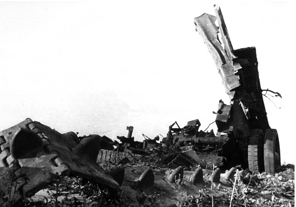 Все, что осталось от «тридцатьчетверки» после взрыва боекомплекта. Поле западнее Прохоровки. 21 июля 1943 г. (Архив Н.Ю. Ротмистрова)