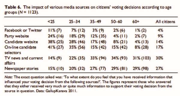 Показательны, например, данные финских выборов 2011 года, когда сайты кандидатов по-прежнему были самым популярным источником информации, необходимой избирателю для голосования, а социальные сети оставались в этом отношении на последних местах.