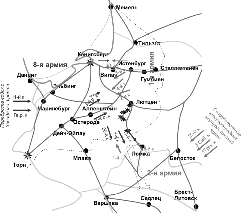 Армия Ренненкампфа вышла на линию Кёнигсберг – Лютцен, и игнорировать ее было невозможно. Людендорф уже направил против нее 3-й корпус и армейскую кавалерию. С учетом переброски сил с Западного фронта командование 8-й армии могло сосредоточить против Ренненкампфа три корпуса со средствами усиления. Этого было вполне достаточно.