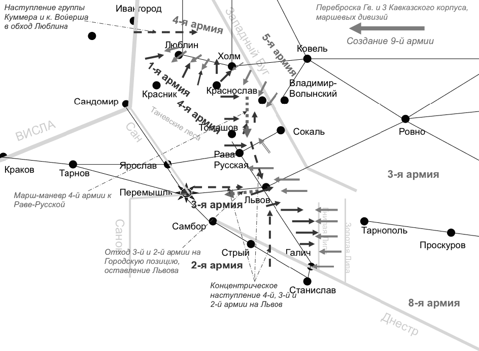 Концентрическим наступлением 2, 3 и 4-й армий на Львов разгромить 3-ю армию в районе этого города и восстановить положение в Галиции.