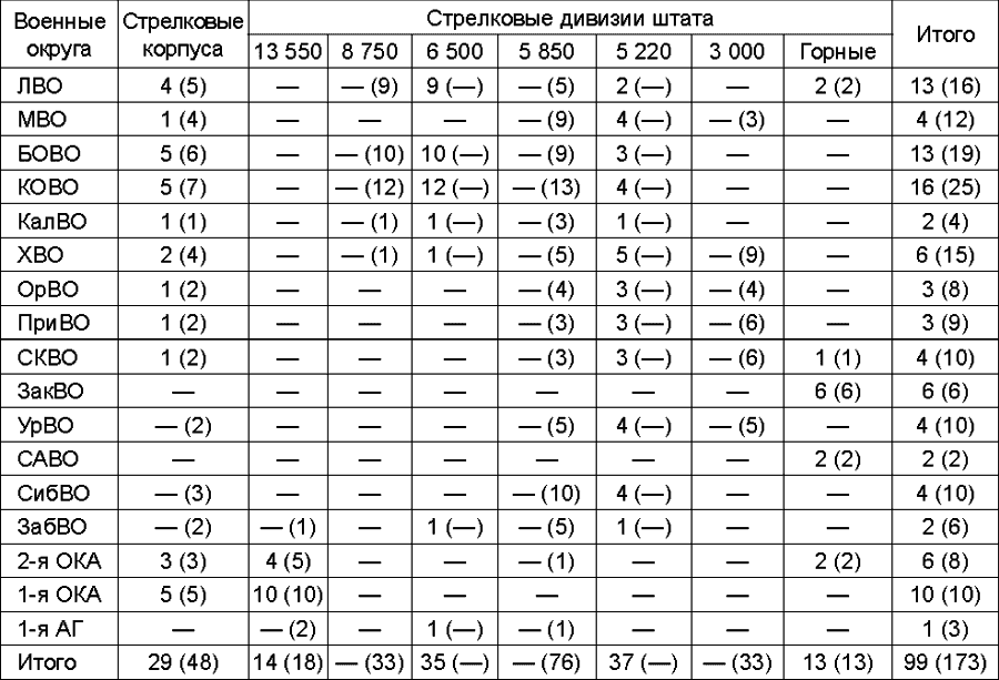 Таким образом, в соответствии с «Планом реорганизации сухопутных сил Красной Армии на 1939–1940 гг.» было решено иметь 173 стрелковые дивизии, переведя дивизии тройного развертывания в ординарные (см. таблицу 1; цифры в скобках – план дислокации от 5 сентября). Предлагалось увеличить количество корпусной артиллерии и артиллерии РГК, переведя ее с тройного на двойное развертывание. Следовало расформировать 4 кавалерийские дивизии и 2 отдельные кавалерийские бригады, а также сократить численность тыловых частей и учреждений. В танковых войсках расформировывались стрелково-пулеметные бригады в танковых корпусах и стрелково-пулеметные батальоны в танковых бригадах, Штатная численность Красной армии была установлена в 2 265 тыс. человек[22].