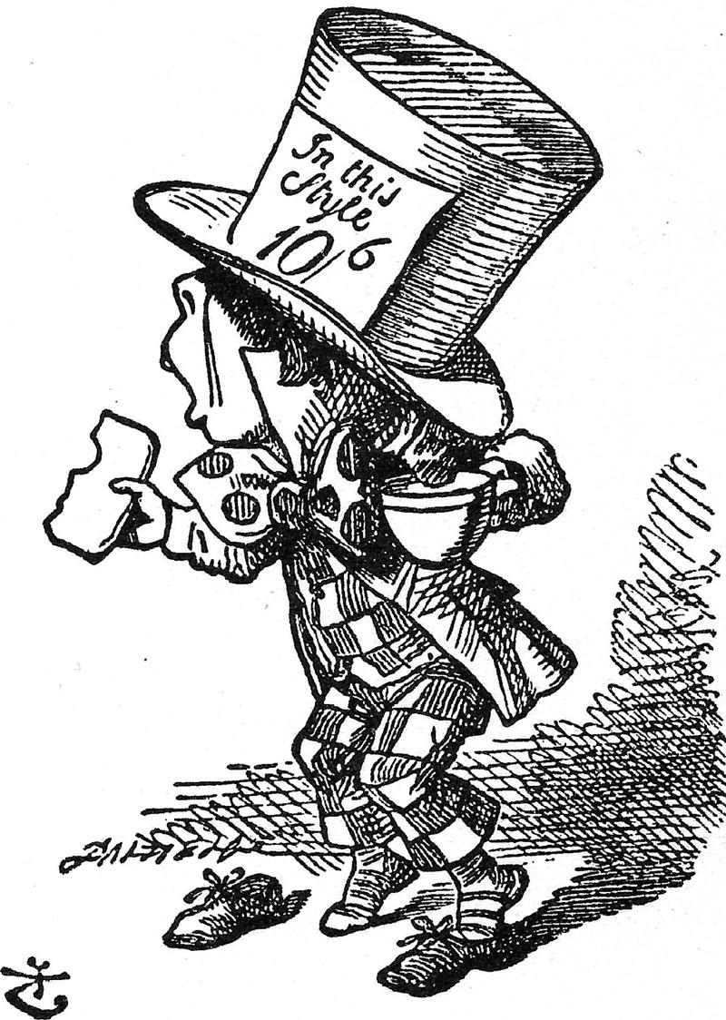 Несмотря на то что Кэрролл интересовался медициной, а Тенниел изобразил в зеркале модницы погибшую от изнурительной работы швею, широкая публика, по всей видимости, оставалась в неведении об условиях труда шляпников. В 1862 году сатирический журнал Punch задавался вопросом: «Нам любопытно будет узнать, от какого такого безумия страдают шляпники и почему они прежде всех других достигли исключительного совершенства в том виде изящных искусств, которому особенно покровительствуют и дают приют в Бедламе»[166]. Бедлам, или госпиталь святой Марии Вифлеемской, был одним из самых известных «домов умалишенных» той эпохи. Статья завершается игрой слов, связывающих фетр и ощущения[167]: «Мы полагаем, что можем взять на себя смелость констатировать: безумие шляпника должно заключаться, согласно природе его ремесла, в том, что, как говорится, легче почувствовать (to be felt), чем описать». Поговорка «безумен, как шляпник» (mad as a hatter) – могла обозначать преходящее состояние «безумия», то есть гнев, а не помешательство. Считалось, что она являлась искаженной версией фразеологизма «злой как гадюка» (mad as an adder)[168]. Шляпных дел мастера действительно принимали активное участие в протестных политических движениях как во Франции, так и в Соединенном Королевстве, и, как правило, они были более склонны к совершению насильственных преступлений, умирали в более раннем возрасте и кончали жизнь самоубийством чаще, чем их сверстники-представители других профессий[169].