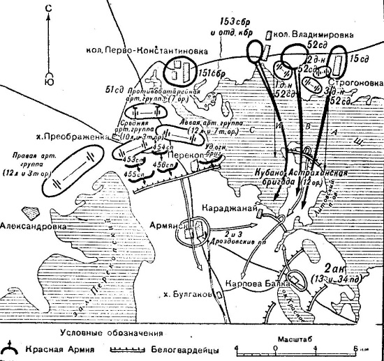 Эти батареи показались мне очень хорошо обустроенными, но мало соответствующими, за исключением полевых орудий, роли, которую войска должны были сыграть в предстоящих боях. Батарея 10-дюймовок располагала бетонированными укрытиями и насчитывала не менее 15 офицеров среди личного состава. Ее огонь был хорошо подготовлен и мог бы достойно вписаться во всю организацию артиллерийского огня, в которой оборона позиций с близкой дистанции осуществлялась бы полевыми орудиями. Но именно этих орудий и не хватало! Так же слабо была организована огневая поддержка пехоты. На берегу Сиваша, вблизи от каменной насыпи железной дороги, находилось примерно до роты личного состава; ближайшие воинские подразделения располагались в пяти верстах оттуда, в Таганаше. На сделанное мною замечание мне ответили, что недостаток оборудованных позиций вынудил отвести войска в места, где они могут получить укрытие от холода.