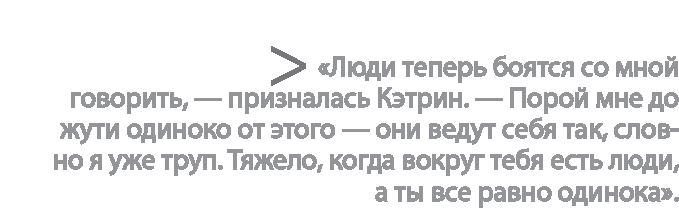 «Люди теперь боятся со мной говорить, – призналась Кэтрин. – Порой мне до жути одиноко от этого – они ведут себя так, словно я уже труп. Тяжело, когда вокруг тебя есть люди, а ты все равно одинока».