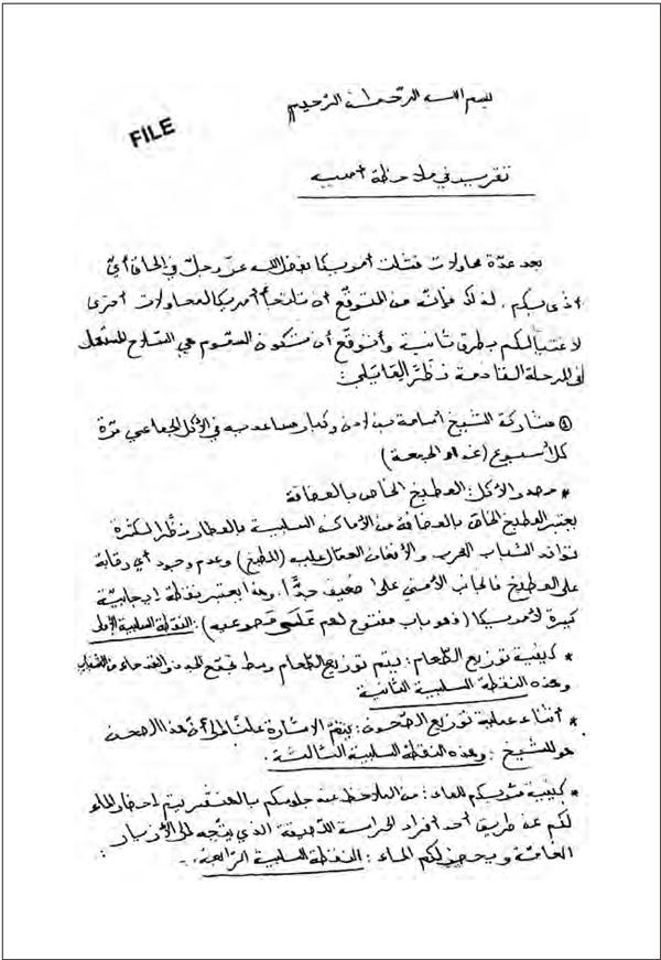 Этот документ, озаглавленный «Донесение о наблюдениях, связанных с безопасностью», найден в архивах Бен Ладена в Абботтабаде. Он предупреждает Бен Ладена о том, что США могут прибегнуть к «иным средствам» для его уничтожения, в том числе к отравлению. Документ не датирован, но он наверняка относится к раннему периоду, предшествующему 11 сентября, поскольку здесь упоминаются открытые появления главаря Аль-Каиды на публике.