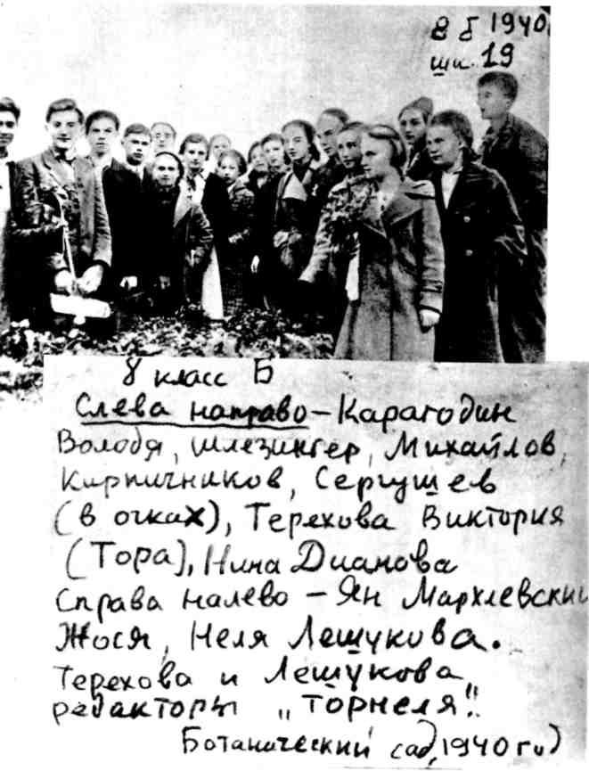 Лева стал писателем еще в школе, не «писакой», как соизволил я пошутить в детстве, а Левка занести в дневник, а настоящим писателем, готовым к вполне серьезным работам, серьезным обобщениям, выводам. Писали мы все — Юра Трифонов, Олег Сальковский, и я, и многие наши девочки. В классе выходил рукописный журнал. Юра для журнала сочинил рассказ под названием «Взгляд смерти»: у человека от сердца к глазам шла тонкая трубка, и глаза человека силой сердца могли погубить врага. Олег пытался написать рассказ, в котором шпион срисовывал железнодорожный вокзал в городе Линце. Почему в Линце? Олег до сих пор объяснить не может. Но что поразительно, уже в зрелые годы, скажем так, Олег попадет в Линц и увидит вокзал… Вика (в детстве — Тора: это от полного имени — Виктория) и Неля Лешукова — обе они из параллельного класса «Б» — выпускали свой журнал «Торнель», в основном он у них был поэтическим. «Каменный ящик — Правительства дом. В каменном ящике все мы живем…»