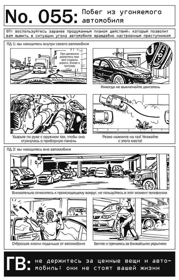 Угоны автомобилей, к которым часто прибегают люди, попавшие в критическую ситуацию и потому решившие воспользоваться оказавшимся у них на пути транспортным средством, могут привести к удержанию находящихся внутри людей (см. раздел 067), то есть к временному их похищению. В ходе него преступник может заставить водителя ездить от банкомата к банкомату и требовать снимать с карточки деньги, которые послужат средством выкупа. Независимо от конечной цели преступника оказаться его заложником в собственном автомобиле — наихудший для вас вариант развития событий, поэтому постарайтесь отдать машину или убежать из нее до того, как враждебно настроенный вооруженный похититель проникнет внутрь. А еще лучше заранее позаботиться о том, чтобы обезопасить автомобиль от угона, для чего вы должны действовать осознанно и внимательно отслеживать происходящее вокруг.