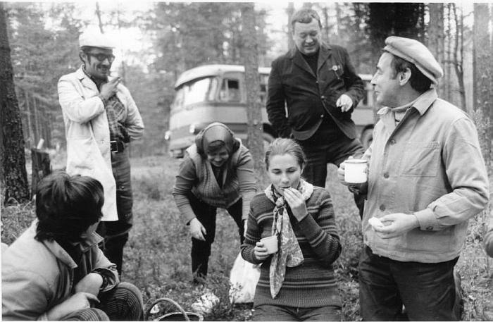 «Аврора» на пикнике. В центре – Елена Клепикова. Стоят слева направо: Владимир Соловьев и Владимир Торопыгин, главный редактор журнала, снятый за публикацию стихотворения о расстрелянной большевиками царице.