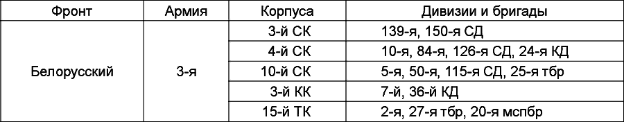«1. 3[-я] армия. Состав: упр[авления] 10 ск и 3 ск; 5, 50, 115, 139 и 150 сд; упр[авление] 3 кк, 7 и 36 кд; 15 тк и 25 тбр; 108 ап РГК.