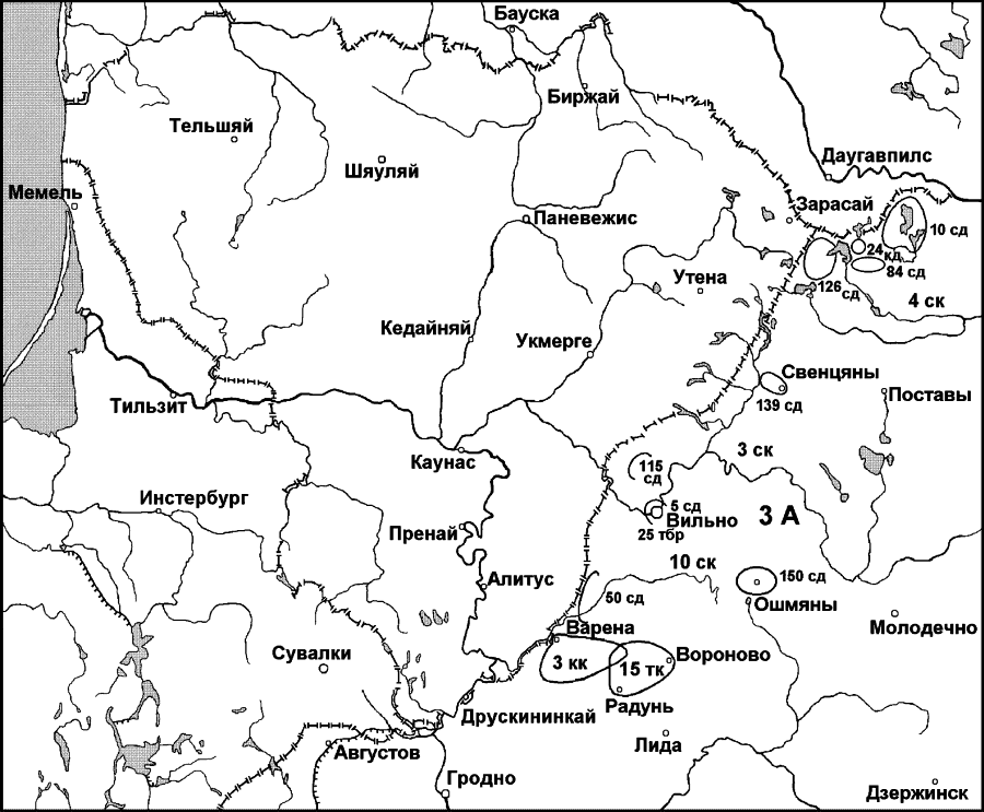 а) на границе с Литвой иметь три дивизии (139, 115 и 50 сд), в резерве армии две сд (одну в районе Вильно и одну – в районе Солы, Слободка, Ошмяна). 139 сд перебросить из района Лида, Неман по ж[елезной] д[ороге] в район Свенцяны; 115 сд – направить из района Лида в Вильно и 50 сд – из района Гродно в Олькеники.