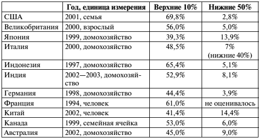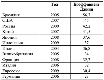 Эта тенденция вывела Штаты в верхние строчки международного рейтинга неравенства как доходов, так и благосостояния, превратив Америку в самую несправедливую из крупных развитых стран мира (см. таблицы 2.1 и 2.2). Неравенство доходов могло бы уравновешиваться социальной мобильностью, соответствующей представлениям об «Американской мечте». Однако в последние два десятилетия социальная мобильность в Штатах существенно застопорилась, тогда как неравенство доходов, наоборот, растет. По приведенным ниже недавним исчислениям коэффициента Джини, характеризующего неравенство доходов, США – вместе с Китаем и Россией – удерживает позорные верхние строки. Более высокий уровень неравенства имеется только у Бразилии, принадлежащей к группе основных развивающихся стран.