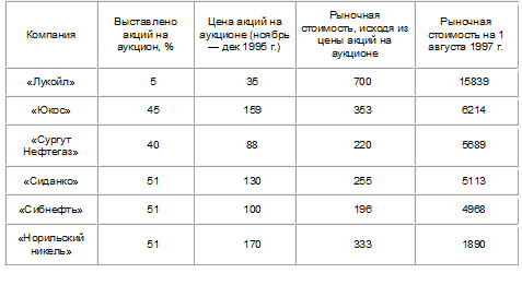 К каждому аукциону допускалось не менее двух участников. Однако победитель почти всегда платил лишь немного больше стартовой цены. Эта цена была искусственной, она не имела никакого отношения к рыночной стоимости компании, что видно из следующей таблицы[9].