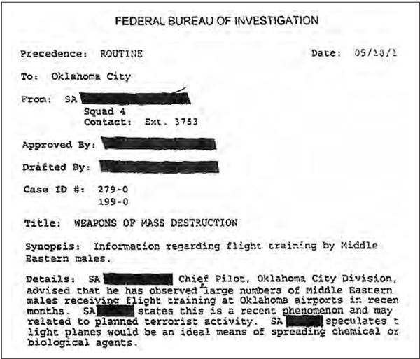 Подробности: согласно сведениям специального агента [имя вычеркнуто по цензурным соображениям], старший пилот авиационной эскадрильи Оклахомы предупредил нас, что заметил необычно много выходцев с Ближнего и Среднего Востока мужского пола, посещающих занятия по обучению мастерству пилотажа в аэропорту Оклахомы в течение последних месяцев. Специальный агент [имя вычеркнуто по цензурным соображениям] отмечает, что это явление – с овершенно новое, и оно может быть связано с планами террористических актов. Специальный агент предполагает, что небольшие самолеты могут стать идеальными средствами для распыления химических и биологических отравляющих веществ.