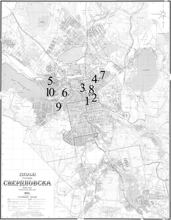 Карта Свердловска с указанием мест исчезновения детей в 1938-1939 г. Обозначено: 1 – похищение 12 июля 1938 г. Герды Грибановой; 2 – попытка похищения 10 февраля 1939 г. Бори Титова; 3 – покушение на убийство 1 мая 1939 г. Раи Рахматуллиной; 4 – похищение 12 июня 1939 г. Али Губиной; 5 – похищение 30 июня 1939 г. Риты Ханьжиной; 6 – похищения 22 июля 1939 г. Вали Камаевой; 7 – похищения 27 июля Лиды Сурниной; 8 – похищение 20 августа 1939 г. Ники Савельева; 9 – исчезновение 12 сентября 1939 г. Вовы Петрова; 10 – исчезновение 2 октября 1939 г. Таси Морозовой от дома №22 по ул. Плеханова в посёлке Верх-Исетского завода (ВиЗ). Бросается в глаза, что активность похитителя в началу октября 1939 г. была локализована на трёх сравнительно небольших участках – в Сталинском районе (4 эпизода), посёлке ВиЗа (4 эпизода) и в Пионерском посёлке (2 эпизода). Из этого можно было сделать вывод, что преступник в своих действиях руководствуется некоторым лимитом времени, которым может свободно располагать и за границы которого не может выходить. Зная, что похититель молод и вряд ли живёт самостоятельно, органам следствия можно было предположить, что ищут они не уличного подростка, а школьника, либо учащегося, находящегося под плотным родительским надзором. Время последних похищений, имевших место после окончания школьных каникул (Вова Петров – после 12 часов и Тася Морозова – около 17), прекрасно соответствует такому предположению. Принимая во внимание, что преступник будет стремиться постепенно расширять район своей активности, к чему его будет подталкивать осторожность и рост уверенности в своих силах по мере набора опыта, органы следствия могли обоснованно предполагать, что новые похищения произойдут в северных или южных районах Свердловска. Именно там – в посёлках: Уралмаш, Сталькан, Хладокомбинат – правоохранительным органам можно и нужно было ждать новых похищений. Подобный перспективный анализ позволял правоохранительным органам сработать на упреждение и принять меры к задержанию злоумышленника с поличным.