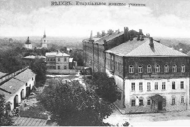 По актам монастырского архива существование монастыря становится известным с царствования Иоанна Грозного, именно – с 1557 г. Вместе с основанием монастыря князья обеспечили его существование, приписав к нему в вечное владение свои богатые вотчины, и избрали его местом своего погребения и вседневного церковного поминовения по умершим из рода в род. В Смутное время монастырь был разорен и сожжен литовцами. Смутное время, бывшее временем «московского разоренья», по отношению к монастырю в монастырских актах называется временем «монастырского разоренья». До конца XVII стол. монастырь существовал деревянным зданием. Но в 1651 г. монастырские церкви сгорели, и с этого года монастырь начинает обстраиваться каменными зданиями. В 1686 г. была выстроена и освящена Спасо-Преображенская церковь. В 1695 г. возобновлены св. ворота и на них устроена церковь св. Алексея, митр. московского. В 1698–1700 гг. построена Введенская церковь и в 1706–1712 г. выстроена церковь во имя Иоанна Предтечи. В 1719 году пожаром истреблен был весь город Белев, вместе с ним сгорел и монастырь. После пожара церкви были возобновлены в том же числе и с теми же наименованиями. Из построек, произведенных в церквах в сравнительно недавнее время, более крупная состояла в постройке в 1864 г. заново трапезы при Введенской церкви на сумму 9000 рублей, завещанную белевским купцом Ив. Макаровым, и на пожертвования других благотворителей. Трапеза построена в два яруса с 5-ю приделами. Из них три в верхнем ярусе. Средний (главный) – во имя Казанской Божией Матери; с правой стороны – во имя Пафнутия Боровского, а с левой – во имя св. Димитрия Солунского. В нижнем ярусе приделы: с правой стороны – во имя Божией Матери «Всех скорбящих радость», с левой – во имя трех Святителей.
