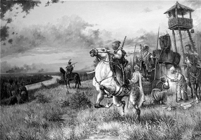 Иван с Кузьмой казаки молодые, хозяйством еще не обросли. Поэтому на государеву службу пришли безо всего. Коней им из сотенного да государева табуна дали, да по копью из государевой казны. У других казаков копья свои были, а у некоторых даже сабли, более опытные казаки получили пищали и боезапас к ним. Только сторожевые казаки ехали на своих конях, да ещё один в запас и с основательным запасом продуктов и всякого имущества, вплоть до гвоздей, лошадей подковать. Потому что ехали они на государеву службу не на три месяца, как все, а на полгода. Им все подчинялись, они всем командовали. А забот у сторожевых казаков было много. Ну, прежде всего службу наладить, чтобы станицы за степью внимательно присматривали, на одном и том же месте два раза не ночевали, не пропустили врага лютого на наши земли. Оборону крепостцы организовать, на случай прихода лихих людей. Своим подчинённым быт и кормёжку наладить, а в случае обнаружения в степи войска чужого, немедленно посылать гонцов в близлежащие крепости с тревожными вестями. А если проворонят они те самые войска, то перед государем и народом русским ответ держать по всей строгости.