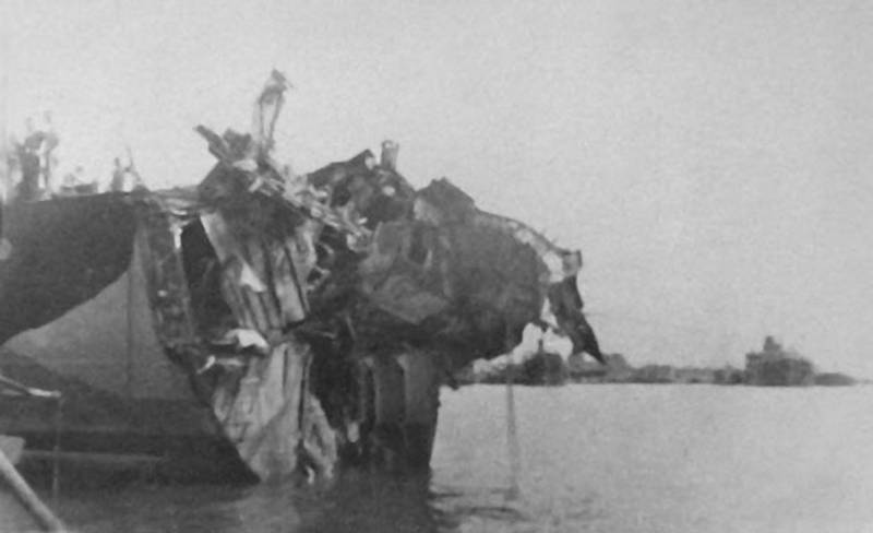 Корма крейсера «Молотов» после попадания торпеды 2 августа 1942 г.