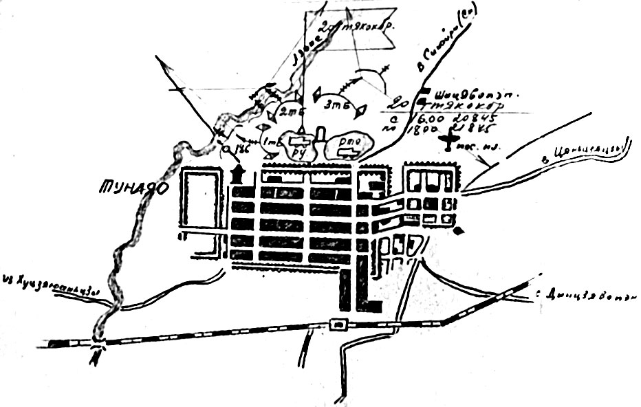 Всего из ТУНЛЯО выступили 41 танк и 18 колесных машин. Из отставших танков до ТУНЛЯО – 10 танков прибыло в ТУНЛЯО и находятся на северном берегу р. ЛЯОХЭ. Всеми танками, находящимися в ТУНЛЯО и у р. ЛЯОХЭ, командует командир 3-го тб гвардии майор ВОРОБЬЕВ. В ТУНЛЯО находятся заместитель командира бригады по строевой части гвардии подполковник ТУШЛИДЕР, заместитель командира бригады по техчасти гвардии подполковник ВОРОБЬЕВ и заместитель командира бригады по тылу гвардии подполковник ОРЕШКОВ.