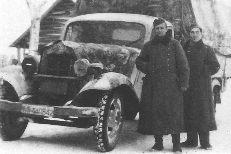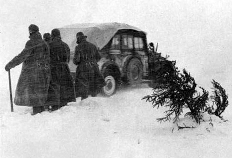 Немецкий легковой автомобиль преодолевает снежную преграду. Район Калинина, ноябрь 1941 года.