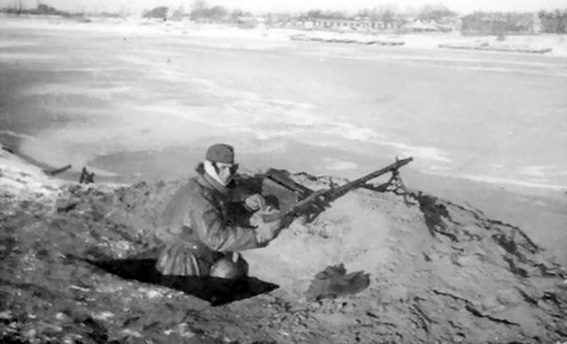 Немецкий пулеметчик в окопе на берегу Волги в районе Калинина.
