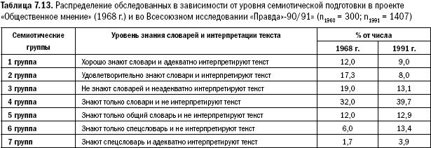 У Т. М. Дридзе было семь семиотических групп, а у меня на пересечении знаний общего и специального словарей прессы и умений интерпретировать текст адекватно его цели, выделять логико-фактологическую цепочку, работающую на цель сообщения, оказалось более 20 групп, которые оказались легко сводимыми к аналогичным семи. Данные по этим семи группам в 1968 и 1990/91 гг. представлены в табл. 7.13 (массив Всесоюзного исследования не перевзвешен, данные не преобразованы, у 77 % респондентов родной язык – русский).