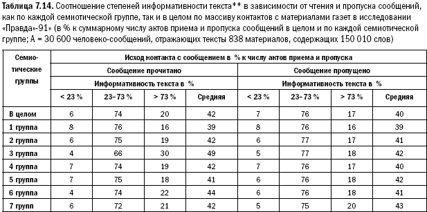 Главное: в процессе реального приема сообщений текста газет отсутствует связь между уровнем семиотической подготовки читающих их респондентов и информативностью текста относительно цели сообщения (табл. 7.14). Коэффициенты связи Пирсона в этой таблице между семиотическими группами и уровнем информативности прочитанного и непрочитанного текста равны соответственно 0,082 и 0,041 (коэффициент Крамера – Чупрова и того ниже: 0,058 и 0,028)[182]. Относительно низка связь и между семиотическими группами и группами по степени осознания своих информационных потребностей (потребностей, заявленных вербально и в разной степени совпадающих с чтением интересующего в реальном поведении; см. табл. 1.12). В матрице «семь на четыре» коэффициент Пирсона равен 0,285, а Крамера – Чупрова – 0,165.