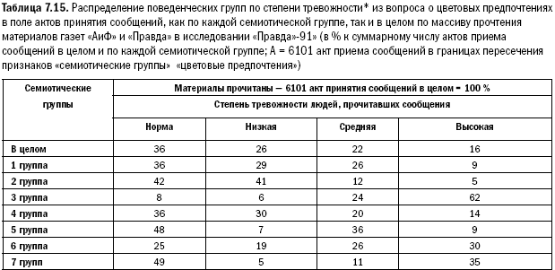 * Степень тревожности определялась по ответам на тестовые вопросы о цветовых предпочтениях. Отличающаяся высокой степенью тревожности 3-я группа стремится брать текст высокой информативности, смысл которого она не может адекватно интерпретировать (табл. 7.14)