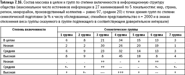 Конечно, картина отклонения в средних по числу источников и степени тревожности в целом не противоречит выводам из распределений частот этих показателей в семиотических группах. Отдельные детали как раз статистически уточняются и, кроме этого, позволяют увидеть картину в целом. Так, например, одинаковые в распределении табл. 7.16 первая и седьмая группы, попадают в разные области по среднему числу используемых источников именно из-за разного объема и в целом, и по непредставительной доле в группе низкой степени включенности в информационную структуру, и из-за разных показателей разброса от средней. Вообще же, однако, «портрет» информационного приема через «сито»-структуру понимания смыслов текста весьма оригинален.