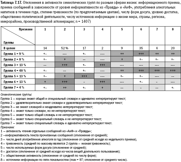 Ко второму пласту относятся третья, пятая, шестая и седьмая группы, которые при всем их различии в деталях объединены повышенной степенью тревожности, выражающейся у третьей, шестой и седьмой групп в цветовых предпочтениях, а у пятой – в уходе в иллюзорный мир с помощью алкоголя. Пятая группа, знающая только общую лексику и не додумывающаяся до смыслов речи, пьет больше среднего со значимостью отклонения выше среднего доли годовых дней пьянства с 95 % вероятностью. Эти «группы-бедолаги» по осторожным оценкам составляли в 1990/91 гг. более 40 % взрослого населения страны. Ни одна из этих групп не дает выше среднего включенность в различные формы жизни, где первая и четвертая занимают благополучное положение. Из 16 «испытательных клеток» активности только в 4 (25 %) эти группы находятся на среднем уровне активности и достатка, а в 75 % – на уровне ниже среднего. Однако их коммуникативное поведение различно. Группа третья («не знают словарей и не выделяют смысла текста») отличаясь высокой степенью тревожности и умеренным употреблением алкоголя, резко снижает число читаемых сообщений (вот в каком качестве и где подтвердилась гипотеза о снижении информационного приема), тяготея из прочитанного к публикациям с повышенной информативностью. Забегая вперед, отмечу, что на пересечении признаков «семиотический уровень» и «статус», взятых в поле прочитанных сообщений, эта группа падает с 13 % до 1 % представительства. И весь этот 1 % стопроцентно состоит из рядовых журналистов местных областных газет. Шестая же группа, знающая только специальную лексику и не умеющая выделять смыслы текста, тревожась, чуть идет в рост в приеме информации, тяготея в этом приеме к информативным сообщениям (здесь растут доли актов приема бригадиров, младших руководителей и высшего звена местного управления). Склонная к алкоголизму пятая, знающая только общую лексику, «ничем не тревожится», читает «как все», несколько повышая информативность прочитанного (возможно потребление темы «спорт», что требует проверки). «Природно умная» седьмая группа, не особо тревожась, тяготеет к среднему уровню по активности чтения высокоинформационных сообщений, которые она объективно способна понять. В целом мы видим ярко проявляющиеся компенсаторные психологические механизмы обращения к информационным потокам в обществе с целью снятия тревоги в ситуации социального коллапса. Это попытка «схватиться за соломинку» в безысходной ситуации. Группам же первого пласта «снимать» нечего, так как они вполне социально благополучны и в приеме алкоголя или информационных потоков для успокоения не нуждаются. Особую нишу занимает вторая группа, умеющая удовлетворительно извлекать из текста его логические смыслы и одновременно активная лишь в сфере досуга. Она являет собой как бы промежуточную, переходную, реагентную область. Опять же и это предположение нуждается в эмпирической проверке.