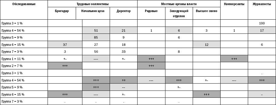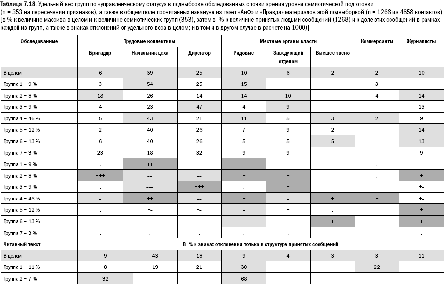 Прежде чем перейти к последней описательной ступени в раскладке семиотических групп и написания их «портрета», пара замечаний. Конечно, группы связаны с признаком «образование»: первая, вторая и четвертая увеличивают вес лиц с высшим образованием. У четвертой – «знают словари, но смыслы „выделяют трудно“» – увеличивается вес лиц со степенью кандидата наук. Третья и пятая тяготеют к малообразованным слоям, а седьмая по отклонениям признака «образование» нерепрезентативна. Работники сельского хозяйства, служащие аппарата предприятий и учреждений, непроизводственная интеллигенция и (особенно резко) пенсионеры, увеличивают свой вес в первой группе. В такой же степени (пенсионеры увеличивают умеренно, а сельскохозяйственные рабочие, наоборот, уменьшают вес) эти социальные группы соотносятся и с четвертой семиотической группой. Рабочие промышленности резко увеличивают долю в третьей и пятой, работники торговли – в третьей, студенты и чиновники растут в седьмой, а инженерно-технические работники в шестой, уменьшая рост в третьей группе. Но самое интересное оказалось в связях по статусу. В результате завышения страт выборки были получены представительные группы работников местных органов власти и журналистов местных газет. Мы воспользовались этим.
