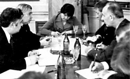 Заседание Смешанной Норвежско-Советской комиссии по рыболовству в Осло в 1978 г. В центре (лицом к нам) начальник Управления внешних сношений и генеральных поставок Минрыбхоза СССР Р. Новочадов и его заместитель В. Зиланов