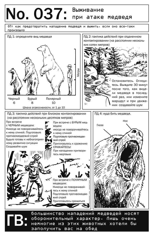 Конечно, какого-то строгого набора правил относительно того, как вести себя при нападении медведя, не существует, что объясняется, в частности, тем, что такие случаи бывают крайне редко. Поэтому неудивительно, что жители тех мест, где обитают медведи, порой вступают в споры друг с другом о том, как нужно действовать при нападении гризли и как — при встрече с черным медведем. Некоторые утверждают, что в первом случае лучше притвориться мертвым, а во втором этого делать не нужно, так как черные медведи гораздо реже нападают на людей. В то же время все соглашаются с тем, что лучшим средством сдерживания медведей является перечный спрей; он настолько эффективен, что его с успехом применяют даже дети, которым еще не исполнилось и 10 лет.