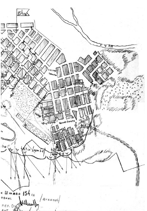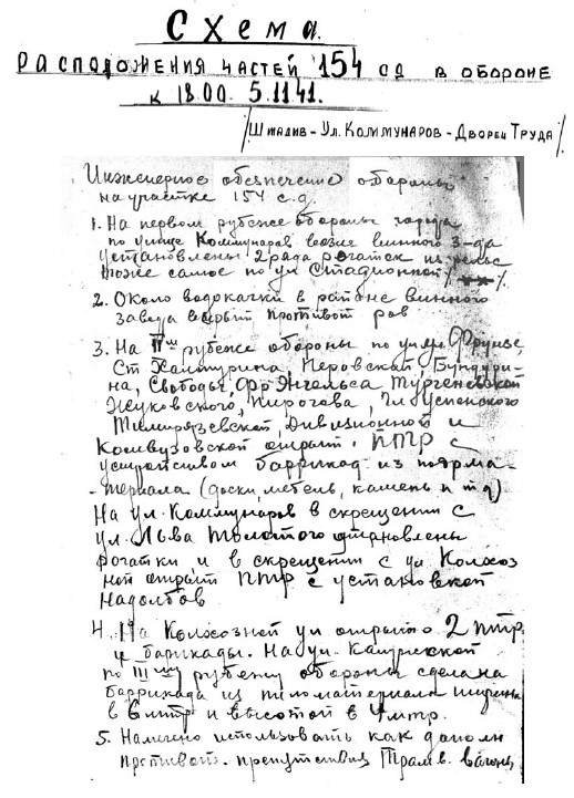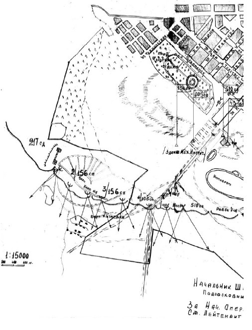 Мною были приняты следующие мероприятия: создавши 3 группы истребителей вооруженных 6 противотанковыми ружьями, бутылками и гранатами и расставив подошедшие подразделения 1005 сп до 400 чел., я приказал занять оборону по шоссе в напр. Кирп завода, одним б-ном в количестве 100 чел., фронтом на Гостеевку, одним в таком же количестве в парке Осоавиахима с задачей отрезать пехоту противника от прорвавшихся танков и группы танковых истребителей поддержанные 2 зенитными орудиями начали уничтожать прорвавшиеся в парк ОСО танки. На участку оставленным 2/156 сп НКВД, направлена группа бойцов 643 КАП в количестве 80 человек, б-н 1005 сп в количестве 150 чел. При поддержке одной пушки ПТО и 2-х зенитных орудий находящихся в р-не общежития ТМИ с задачей восстановить положение 2/156 сп, уничтожая танки и пехоту противника.