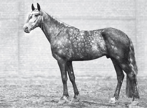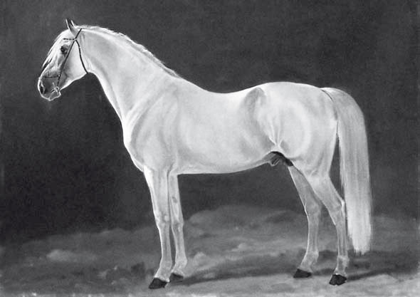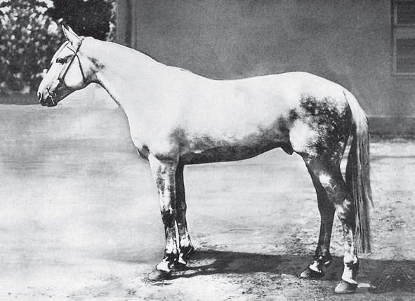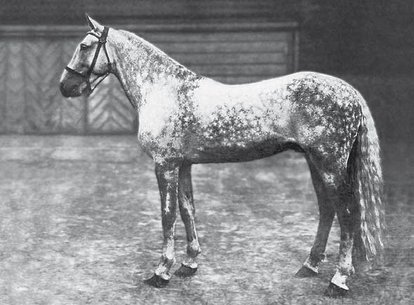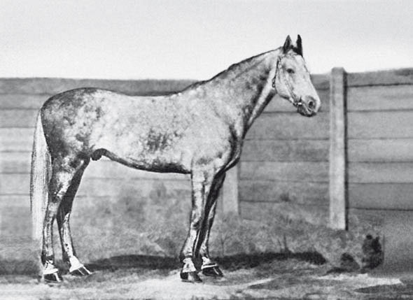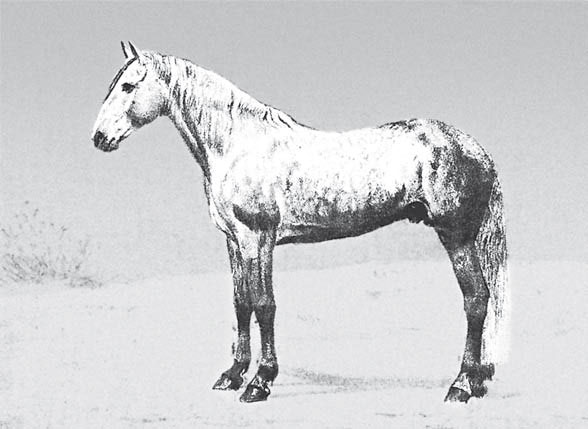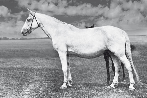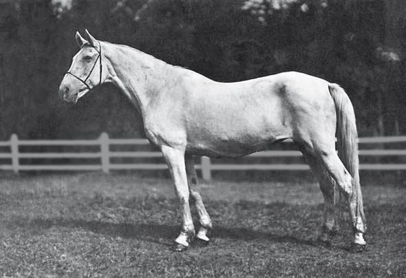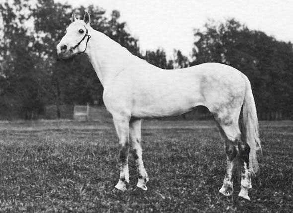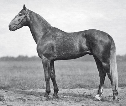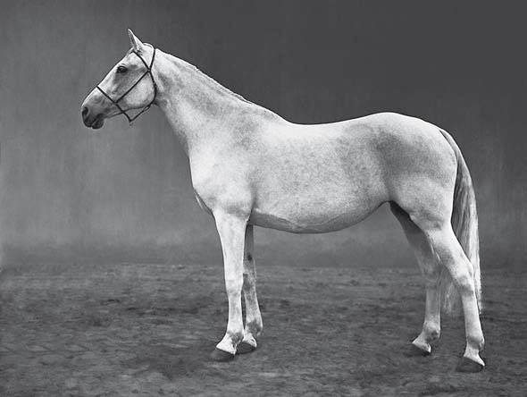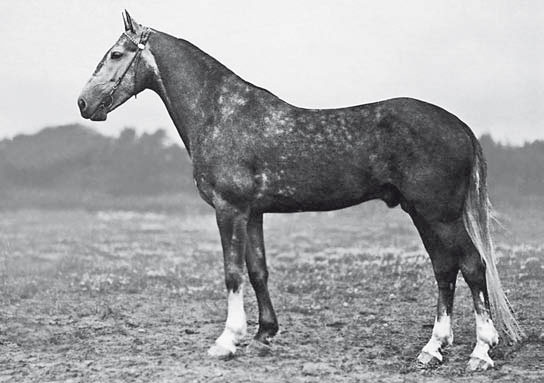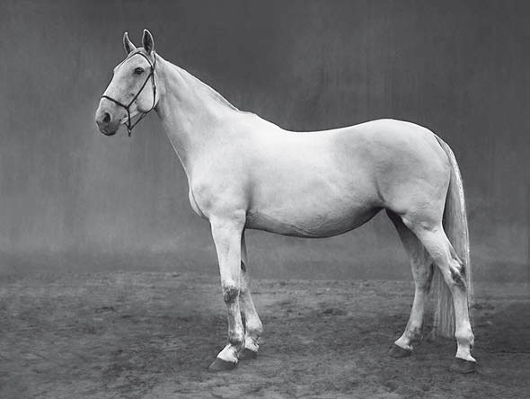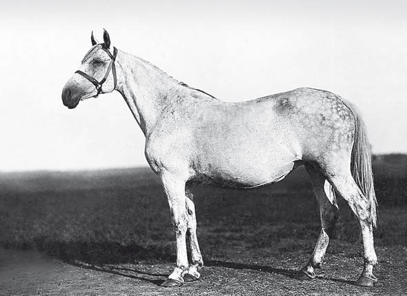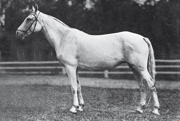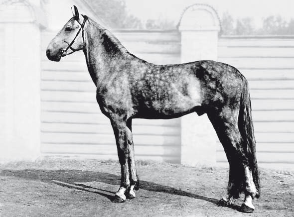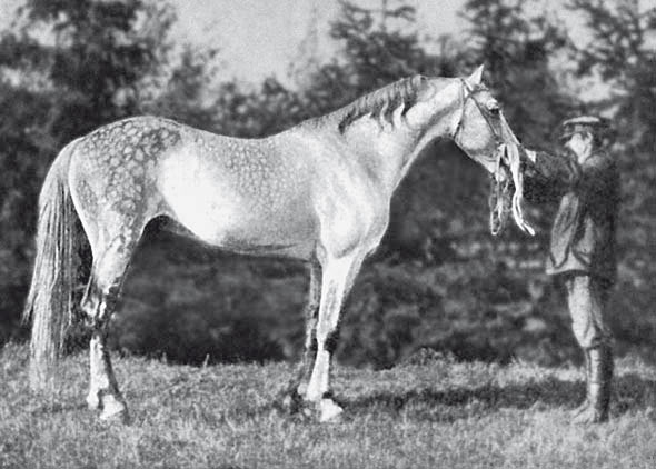 Если спросить любого охотника, каков был по себе Кронпринц, то обязательно услышишь ответ: маленький белый жеребец, узкий и жидкий. Это совершенно неверно. По себе Кронпринц была редкой и весьма интересной лошадью. Почему мое мнение так резко расходится с мнением других охотников? Все судят о формах Кронпринца по тем его фотографиям, которые были напечатаны. А изображение Кронпринца было напечатано лишь однажды, после розыгрыша Императорского приза. Бег этот, как известно, был совершен по грязи и в тяжелых условиях. Стоит ли удивляться, что на этих фотографиях Кронпринц подтянут и имеет утомленный вид. По этим фотографиям нельзя судить даже о типе жеребца, не говоря уже о его формах. В действительности Кронпринц был лошадью высокой породности и превосходного, чисто орловского типа. Он, как и брат его Кот и отец Недотрог, был невелик, ибо в нем было только три вершка росту. Масти он был исключительно белой, с красивым темным обводом вокруг глаз. Кожа у него была тонкая, а шерсть короткая, необыкновенно нежная и шелковистая, на солнце она красиво переливалась и отсвечивала голубыми и розовыми бликами. Грива и челка были умеренной длины, а хвост очень богат волосом и распадался на красивые пряди. Все это было крайне эффектно, и в этом отношении Кронпринц был недосягаемо выше Кота. В этой лошади был свой особый и крайне приятный эрфикс[2]. Мимо этого жеребца, в особенности когда он был в заводском теле, ни один охотник пройти не мог без того, чтобы не залюбоваться. Голова у Кронпринца была небольшая, очень кровная, с широким лбом и хорошим агатовым глазом; шея – почти лебединая, круто поставленная и эффектная; спина неважная, с явным уклоном к холке, но при превосходной связке. Зад и окорока у жеребца были замечательные, ребра много; он был низок на ноге и глубок. Ноги, превосходные по форме, отличались образцовой сухостью, о размете не было и помину, как, впрочем, и у всех остальных детей Недотрога. Кронпринц был широк и широко стоял задом. Вот объективное описание экстерьера этой лошади. Я считаю Кронпринца типичным Лебедем 4-м и ближе именно к этому жеребцу, чем к Лебедю 5-му и его потомству. В заключение скажу, что Кронпринца, когда он был уже в заводе, почти никто из знаменитых коннозаводчиков не видел, а потому и не мог оценить. Лошадь эта, несомненно, вошла бы в большую славу и была бы высоко оценена всеми на выставке, но осуществиться всему этому не дала российская революция.