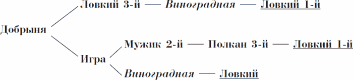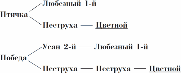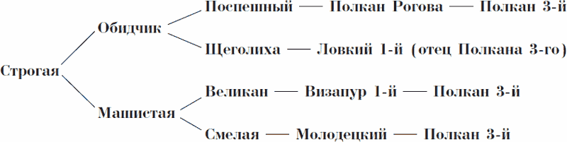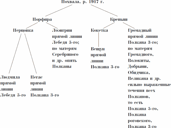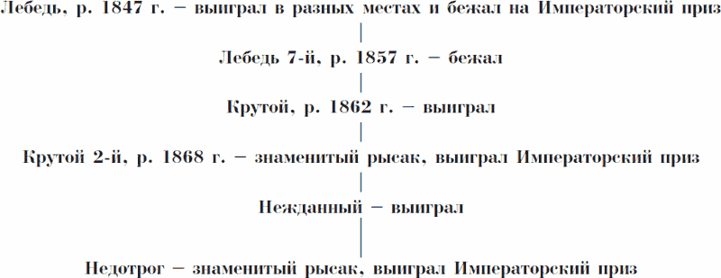 Самое ценное в породе Недотрога, конечно, то, что он происходил в прямой мужской линии от Лебедя 4-го, притом через одного из лучших его сыновей Лебедя 5-го. Весьма важно, что и Лебедь 5-й, и Лебедь, и Лебедь 7-й, и Крутой, и Крутой 2-й, и Нежданный оказались замечательными производителями, то есть вся прямая цепь жеребцов, от которых произошел Недотрог, прославилась на заводском поприще. Не менее важно и то, что начиная с вороного Лебедя все эти жеребцы бежали, и иногда с выдающимся успехом. Вот что получится, если это изобразить графически: