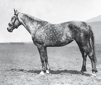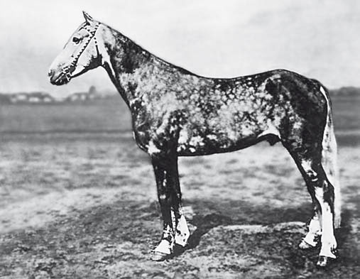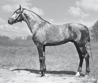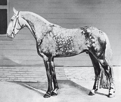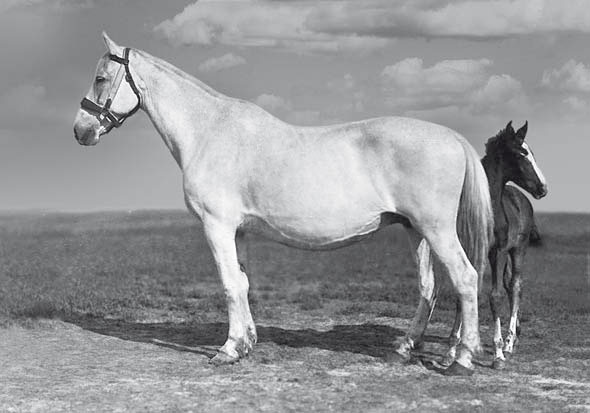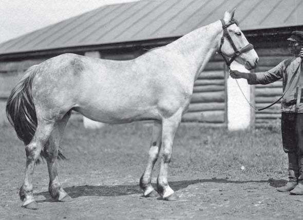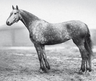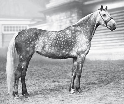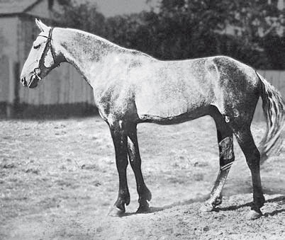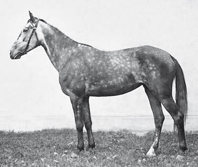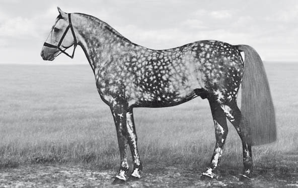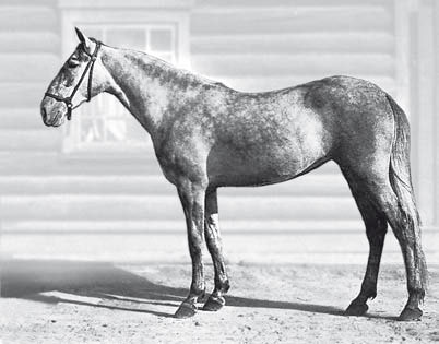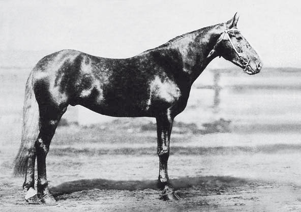 Радуга была невелика – вершков трех, не больше. Масти светло-серой, довольно смешанных оттенков. Интересно, что два ее жеребенка, родившиеся в Прилепах от Громадного, – Рим и Роса – были красно-серыми, причем с сильным буланым оттенком. По себе Радуга была нехороша и довольно прос та. Голова у нее была неприятная, бараньего типа, шея маловыразительная, спина с седлинкой, но удовлетворительная, ноги сухие. Кобыла не производила большого впечатления, но оказалась замечательной заводской маткой. Она пробыла у меня три года и дала трех жеребят. Первого, от Вильбурна М, я должен был вернуть Вяземским, что и сделал, а о двух остальных, детях Громадного, я уже писал. В 1916 году я ее продал за 3 тысячи рублей жеребой от Кронпринца Э. Ф. Ратомскому. В следующем году она принесла серого жеребца, названного Отчаянным-Малым. Выдающийся по резвости, он к тому же был очень хорош по себе. Он получил назначение в качестве производителя в Хреновской завод.