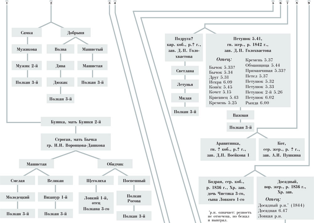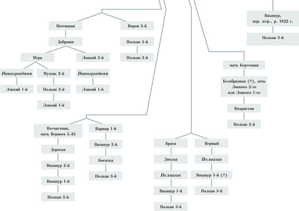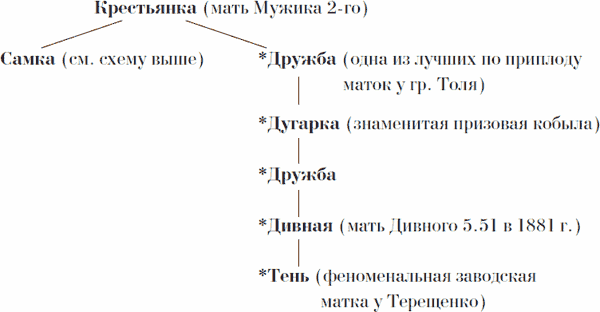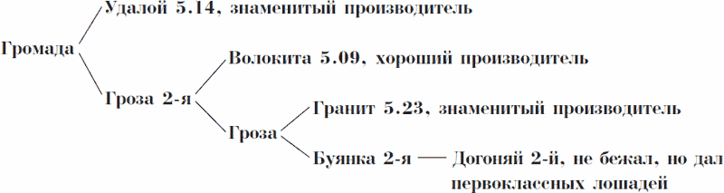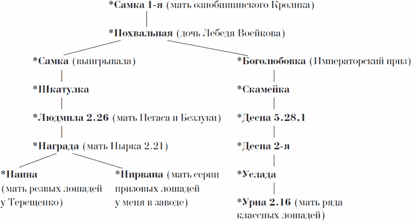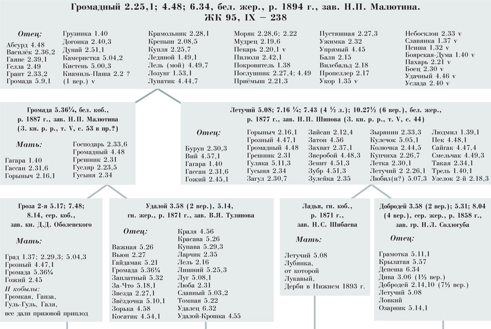 Мальга имела двух дочерей – Мальгу и Забавную. Род Мальги дал в тре тьем колене призовую голохвастовскую Мальгу и сошел со сцены. Род Забавной и до сего времени имеет первенствующее значение в рысистом коннозаводстве нашей страны. Забавная произвела в Хреновом кобылу, названную также Забавной. Эта Забавная оказалась совершенно исключительной заводской маткой. Ее сын Любимец 4-й являлся в Хреновом производителем; ее дочь Хорошая дала этому заводу другого производителя – Чистяка 1-го; еще одна ее дочь, Любимка, стала матерью шести кобыл, получивших заводское назначение, и одного производителя – Волнистого. Третья дочь Забавной, Чембарка, была рано выпущена из Хреновского завода и, поступив к Жихареву, дала у него замечательных лошадей. Достаточно сказать, что от нее в прямом женском колене происходит призовая Милая 5.28,4, мать Моряны, от которой победитель Императорского приза Маг. Четвертая дочь Забавной, Чухонка, дала Вестрису, мать Лестной, от которой Похвальный, едва ли не лучший сын великого Потешного. Похвальный – отец Паши, от которого хреновской Полкан и Зенит князя Вяземского. Наконец, последняя дочь Забавной, Залётная, дала двух замечательных лошадей – Льва и Лебеду, а также Ворона завода Казакова. Ворон вошел в породу некоторых резвых лошадей, и от него в прямом мужском колене происходит жеребец Степенный, отец моей Феи, от которой Фудутун 4.41 и другие резвые лошади. Лев прославил завод Нарышкина и в свое время показал себя резвым призовым рысаком. Он дал Ловкую, от которой Заветная – мать Закрасы, прославившейся благодаря своей деятельности в заводе Малютина. Дочерью Льва была и другая замечательная кобыла – Добрая, мать Добряка, Петуха, Доброй 2-й и др. Поскольку со стороны своей матери Храброй Добрая происходит от жеребца Птички, то имя Пеструхи (дочери Цветного) в ее родословной повторено дважды. Родная сестра Льва кобыла Лебеда дала в Хреновом такого производителя, как Бравый. От него появился Балагур, тоже оставленный заводским жеребцом и давший Баскака 2-го. По себе Баскак 2-й был замечательной лошадью, кроме того, очень резов. К сожалению, Баскака 2-го не оставили производителем в Хреновском заводе, а уступили за 5 тысяч рублей графу Строганову. От Баскака 2-го родились первоклассный Шалун, классный Уголёк и другие резвые лошади.