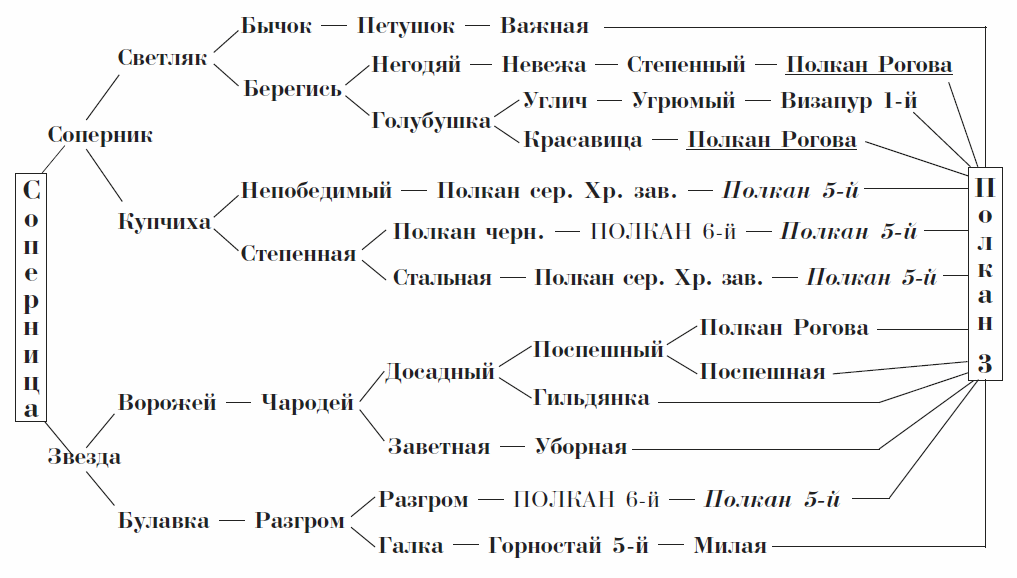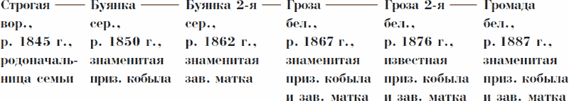 Итак, я рассмотрел потомство дочери Пеструхи Натужной, потомство другой ее дочери, Пеструхи от Кролика 1-го, и заводскую деятельность ее сына Птички. Так что же представляла собой эта знаменитая женская семья, родоначальницей которой была Гнедая из Мекленбурга? Приведенные сведения показывают, сколь велико и исключительно значение этого женского рода в истории рысистой породы. Из него произошли такие великие производительницы, как Победа, Гильдянка, Сабля, Икунья, такие знаменитые кобылы, как Маришка, Простуха, Усмань, Плотная, Забавная, Отмена, Либава и многие другие, не говоря уже о жеребцах Добром 3-м, Льве и Бедуине!