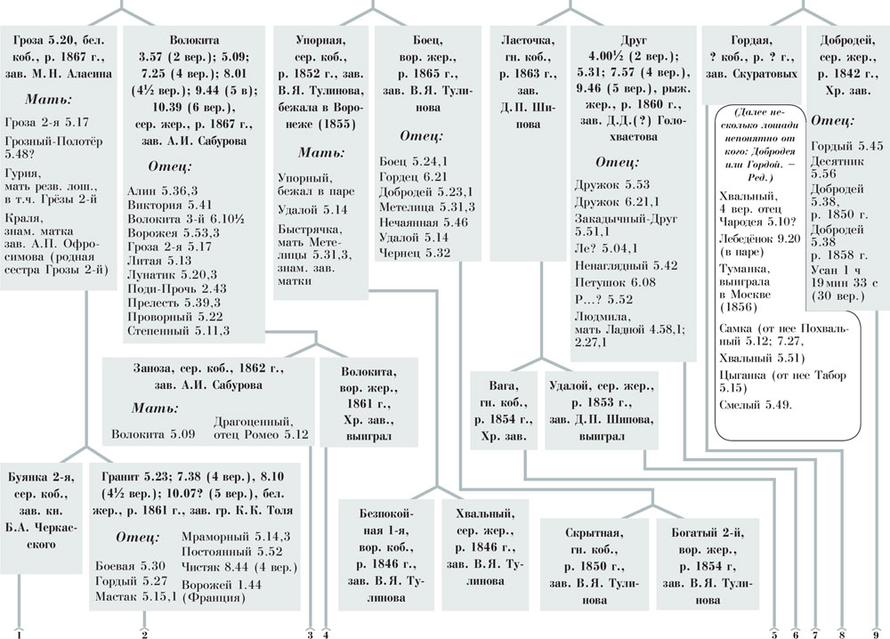 Об утрате в моем заводе прямой женской линии Гильдянки 2-й я никогда не сожалел, так как эта кобыла была не в орловском типе, да и присутствие в ее родословной имен Лебеды 2-й и Податного меня мало удовлетворяло. Эти имена гарантировали, конечно, класс будущих лошадей, но неизбежно должны были отрицательно отразиться на типе, формах и ходе, а им я всегда придавал не меньшее значение, чем резвости.