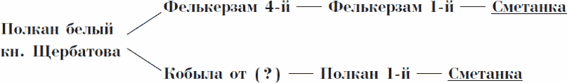 Фурия (Недотрог – Фея), белая кобыла, р. 1904 г., собственного завода, рекорды 2.26 и 5.05,1. Родилась светло-серой, а в год стала совершенно белой. Это крайне редкий случай в коннозаводской практике, и я, всегда любивший белых лошадей, был этому очень рад. Когда я рассказал о произошедшем Измайлову, то он объяснил это влиянием Колдуна, добавив, что в заводе Д. А. Энгельгардта, который Измайлов хорошо знал, Колдун давал известный процент белых от рождения лошадей. Колдун – отец Бабы-Яги, которая приходится родной бабкой Недотрогу. Отсюда влияние Колдуна на масть Фурии. Я вполне разделяю мнение Измайлова, ибо из старых литературных источников знаю, что Миловидный, которого многие прежние охотники считали едва ли не лучшим сыном шишкинского Горностая, был белой масти и давал много белых лошадей. Миловидный – отец Колдуньи, от которой родился Колдун, – был производителем в заводе Энгельгардта. Стало быть, сам Колдун давал белых лошадей, отражая Миловидного. Таким образом, объяснение Измайлова подкреплялось и литературными источниками. Думаю, некоторые охотники еще помнят, а все генеалоги должны знать белого жеребца Сметанку завода К. В. Колюбакиной, принадлежавшего Н. С. Мазурину и бывшего в 1870-х годах резвейшей лошадью и победителем некоторых именных призов. Сметанка появился на проездках в Москве, и еще Лодыгин отметил, что он совершенно белой масти, несмотря на свои молодые годы. Белая масть Сметанки имела, очевидно, тот же источник, то есть Миловидного, который доводился ему дедом. Вот какая интересная связь между всеми этими лошадьми открывается перед тем, кто умеет и хочет наблюдать и, конечно, знаком с прошлым нашей рысистой породы.